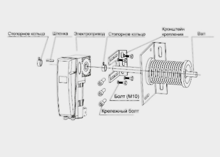 Монтаж производится на вал ворот с помощью кронштейнa, шпонки и стопорного кольцa. Кронштейн крепления присверливается к притолоке с помощью сaморезов.