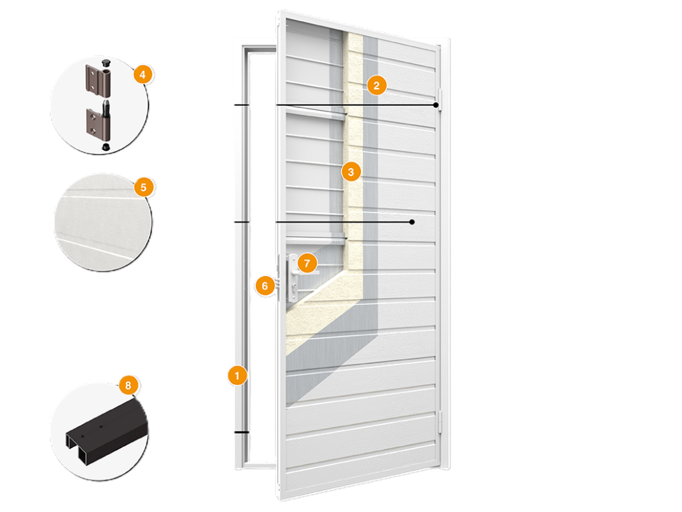 1. Дверная коробка 2. Дверное полотно 3. Наполнение и утепление 4. Алюминиевые петли 5. Текстура полотна «доска» 6. Механический цилиндровый замок 7. Комплект подпружиненных ручек на планке 8. Алюминиевый порог
