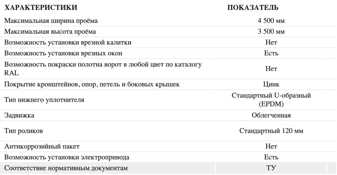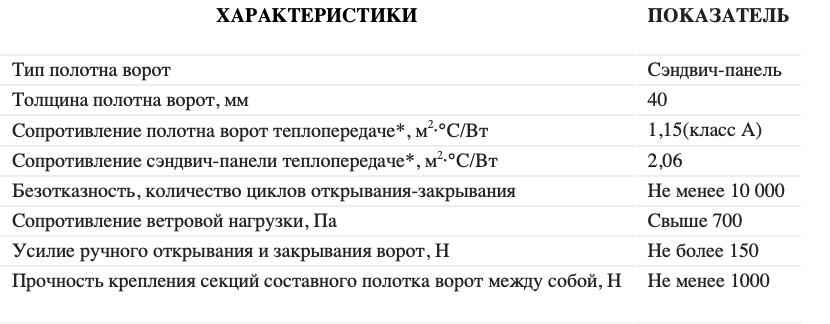 • - Значение зависит от размера ворот, в таблице указано значение для ворот размером 2500×2200 мм. • ВНИМАНИЕ! При эксплуатации ворот из сэндвич-панелей в экстремальных** температурных условиях возможно выгибание полотна и, как следствие, ухудшение технических характеристик конструкции, вплоть до полной потери работоспособности. • ** - к экстремальным температурным условиям относятся случаи, когда между температурами наружных и внутренних стальных листов сэндвич-панелей существует сильное различие (более 40°С). В зоне риска в зимнее время оказываются ворота, эксплуатируемые в отапливаемых гаражах, а в летнее время — ворота темных цветов, установленные на солнечной стороне.