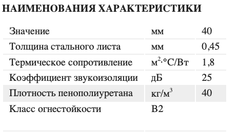 • Толщина панели 40 мм соответствует требованиям ГОСТ 31 174−2000 и обеспечивает стабильную и устойчивую термоизоляцию в диапазоне от +70 до -50°С. • Внутренний и наружный лист сэндвич-панели изготавливаются из оцинкованной стали толщиной 0,45 мм, на которую, с двух сторон, нанесен защитно-декоративный слой полиэстера толщиной 25 мкм. Наружные стороны сэндвич-панели защищены от случайных повреждений полиэтиленовой пленкой. Пленку необходимо незамедлительно удалить после монтажа изделия. • Узел соединения сэндвич-панелей сконструирован таким образом, чтобы обеспечить их плотный контакт за счет глубокого проникновения нижней панели в верхнюю и одновременно исключить возможность расклинивания верхней панели за счет фиксации ее терморазрыва саморезами/