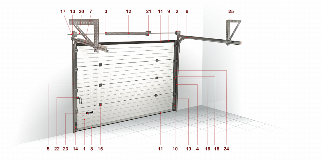 Конструкция ворот простая и практичная. Сэндвич-панели подвижно соединяются между собой петлями, по их краям установлены ролики, которые при открывании ворот движутся по направляющим, установленным по бокам проема ворот. При открывании ворота поднимаются вверх и за счет подвижного соединения панелей, полотно ворот поднимается под потолок, переходя из вертикальной плоскости в горизонтальную. При закрывании все происходит в обратном направлении.