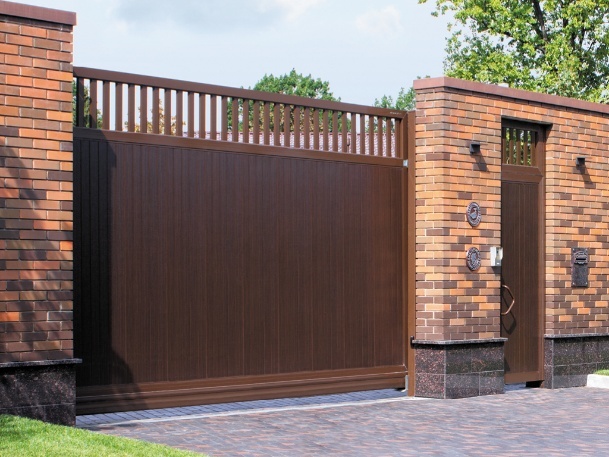 Откатные уличные ворота стандартных размеров в алюминиевой раме с заполнением сэндвич-панелями SLG-A