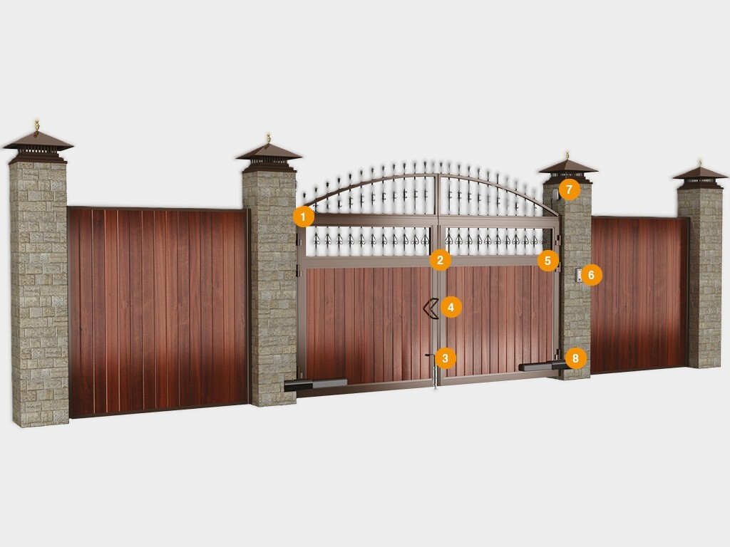 1. Поверхность алюминиевых профилей покрыта порошковой эмалью. Качество покрытия полностью соответствует мировому стандарту Qualicoat. 2. Технологические просветы между створками ворот, а также между крепежными столбами и створками закрываются специальным профилем. 3. С внутренней стороны распашных ворот устанавливается задвижка. 4. Алюминиевая ручка устанавливается в полотно ворот, позволяя открывать их как с внутренней, так и с внешней стороны. 5. Регулируемые петли с износостойкими подшипниками. 6. Автономный антивандальный водонепроницаемый контроллер KEYCODE предназначен для управления одним устройством, также может быть использован как внешняя клавишная панель или устройство считывания карт. 7. Светодиодная сигнальная лампа LAMP-LED предназначена для оповещения о движении полотна ворот во время всего цикла открытия или закрытия. Применение светодиодных элементов сокращает энергопотребление и существенно увеличивает срок службы лампы. 8. Электромеханические приводы серии SWING — оптимальное решение для автоматизации бытовых и промышленных распашных ворот со средней и высокой интенсивностью использования. Преимуществом данных приводов является возможность их установки на узкие столбы.